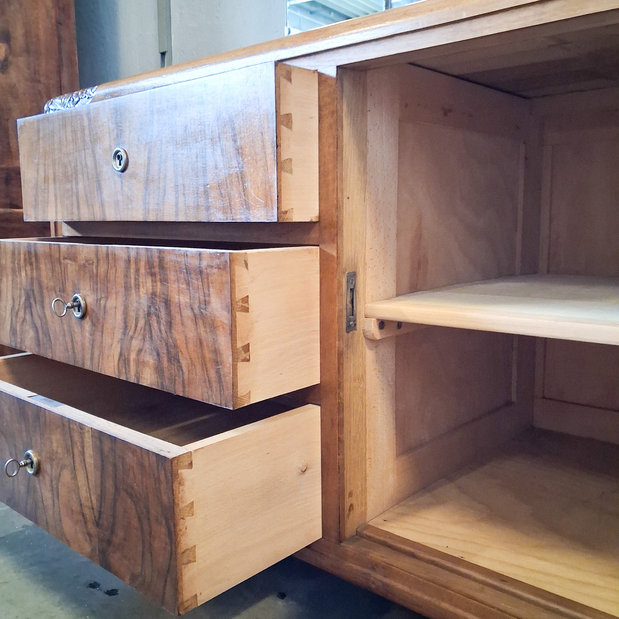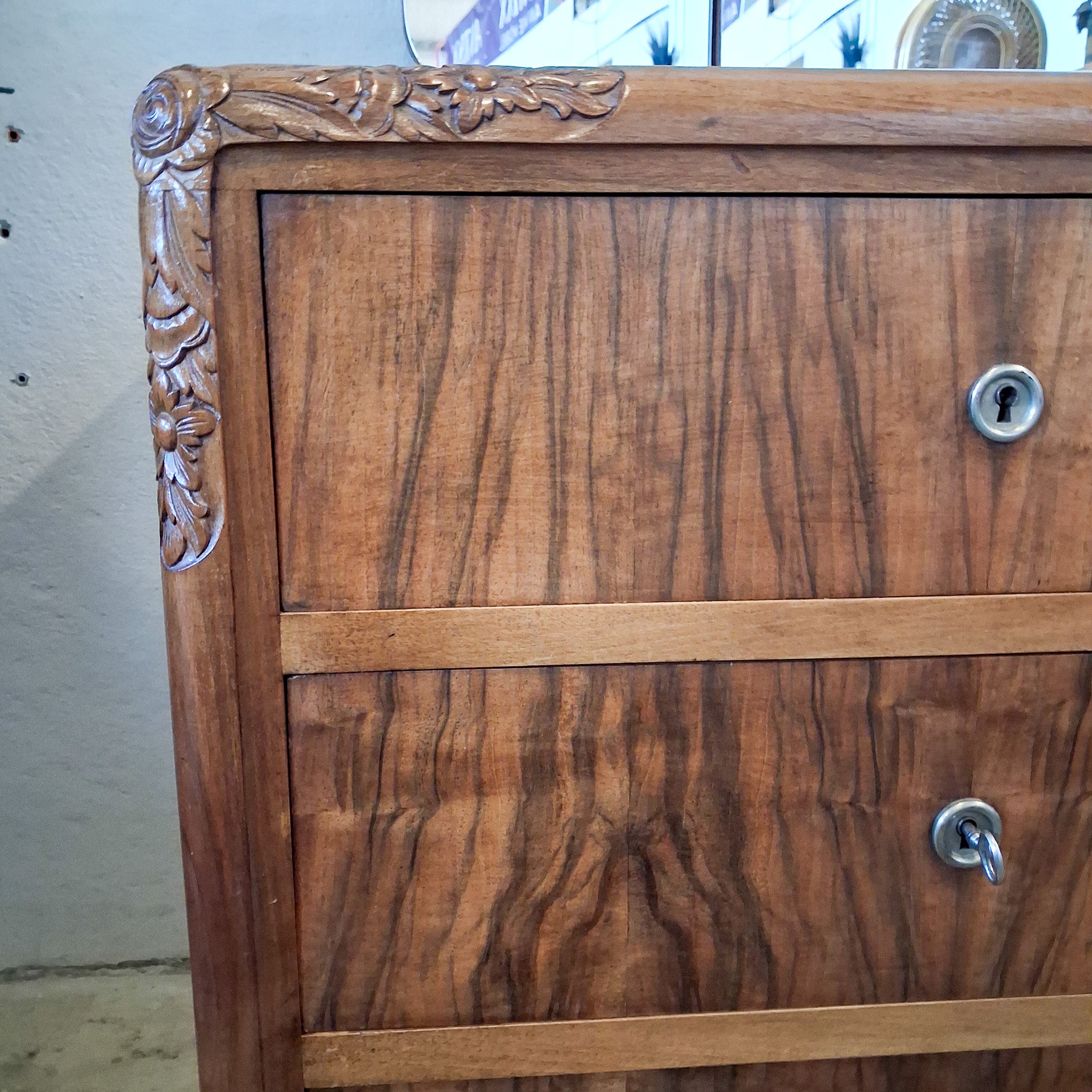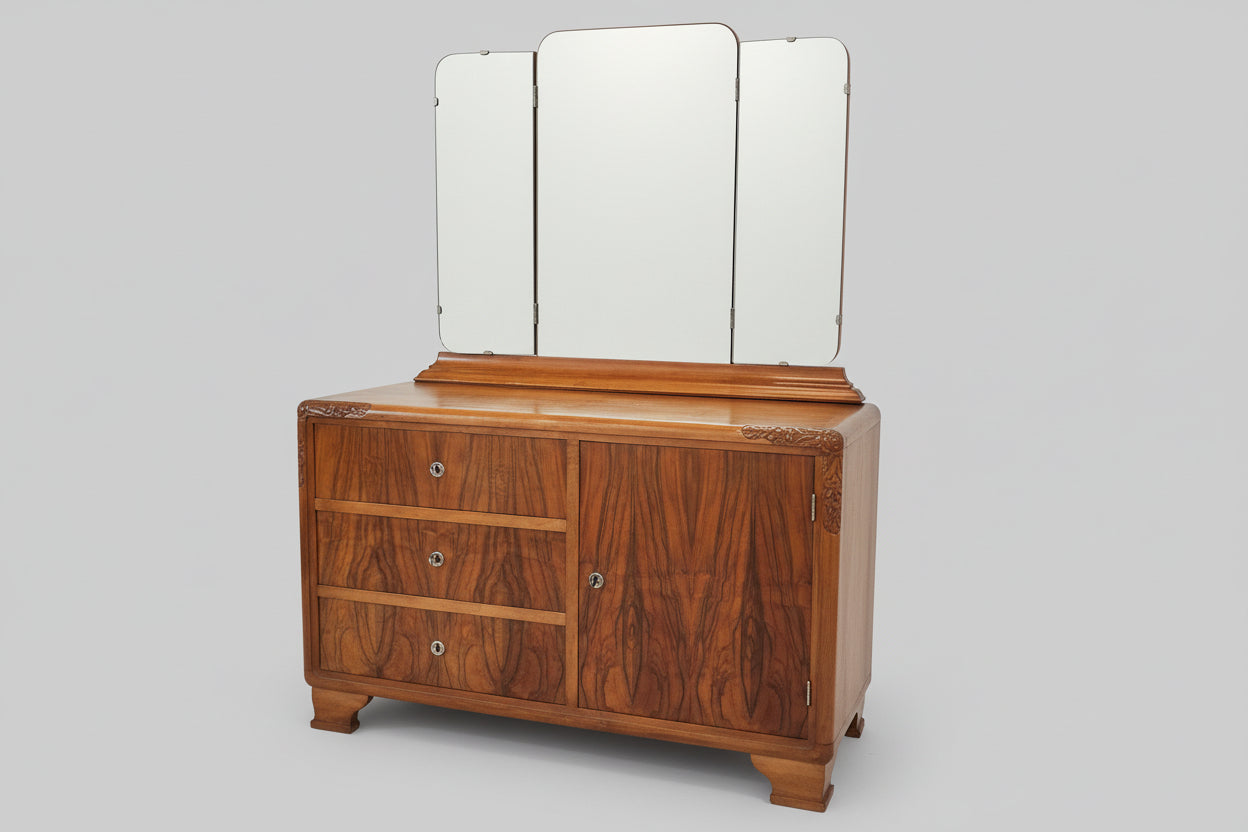Elegante Art-Déco Kommode/Frisiertisch mit dreiteiligem Klappspiegel und viel Stauraum. Markante Nussbaum-Maserung, solide Verarbeitung mit gezinkten Schubladen – ideal als Schlafzimmer-Kommode, Schminkplatz oder Flur-Statement.