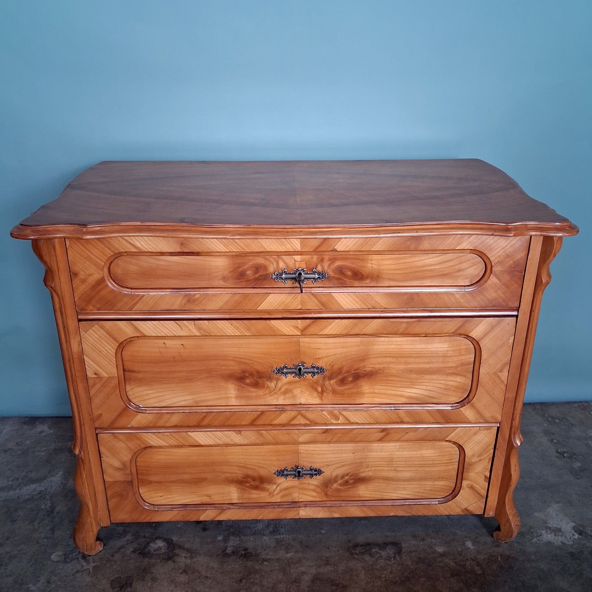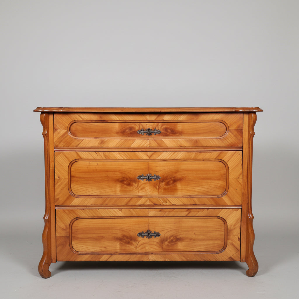 Elegante antike Biedermeier-Kommode aus Frankreich mit wunderschönem Kirschbaumfurnier und klassischer Dreischubladen-Aufteilung. Die lebendige Spiegelmaserung und die geschwungene Deckplatte verleihen diesem Möbel eine besonders warme und wohnliche Ausstrahlung.